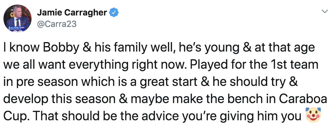 利物浦名宿卡拉格直接转发了邓肯经纪人的推特,并就此事给出了他的建议,卡拉格写道:“我很熟悉博比以及他的家人,他还很年轻,在这个年纪我们都是什么都想要的。季前赛中,博比能为一线队效力,这是非常棒的开始,他应该努力在赛季中继续发展,或许争取能坐上卡拉宝杯的替补席。你(指邓肯的经纪人)应该给他这样的建议,你这个小丑。”