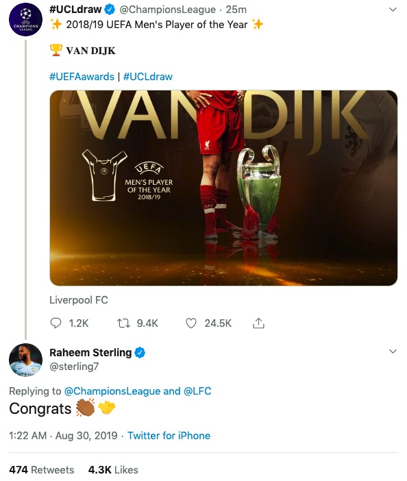 大赢家8月30日讯 利物浦中卫范戴克当选欧足联上赛季最佳球员后,曼城前锋斯特林在推特上送上祝贺。